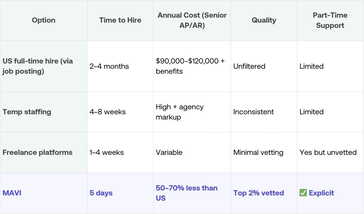 The same logic applies to AR. Companies with stable, predictable invoicing cycles often find that a part-time Senior AR Specialist through MAVI covers 100% of their AR needs at significantly lower cost than a full-time US hire.